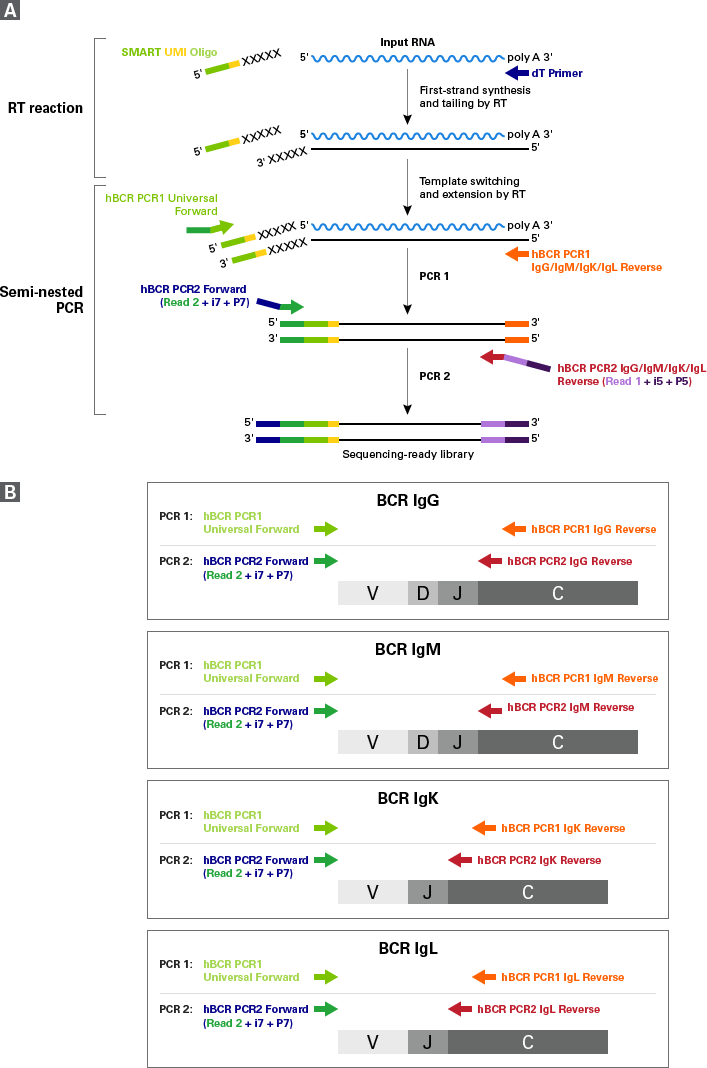 Figure 1. SMARTer Human BCR IgG IgM H/K/L Profiling Kit workflow. Panel A. First-strand cDNA synthesis is dT-primed and performed by the MMLV-derived SMARTScribe Reverse Transcriptase (RT), which adds nontemplated nucleotides upon reaching the 5′ end of each mRNA template. The SMART UMI Oligo anneals to these nontemplated nucleotides and serves as a template for the incorporation of an additional sequence of nucleotides into the first-strand cDNA by the RT (this is the template-switching step). The first strand cDNA is then subjected to two rounds of gene-specific PCR amplification (see details in panel B). The nested PCR in the second round ensures that the vast majority of the reads map to B-cell receptor transcripts. Panel B. The first PCR uses the first-strand cDNA as a template and includes a forward primer with complementarity to the Illumina Read Primer 2 sequence (PCR1 Universal Forward primer), and a reverse primer that is complementary to the constant region of BCR heavy or light chains (PCR1 IgG/IgM/IgK/IgL Reverse primers). By priming from the Read Primer 2 sequence and the constant region, the first PCR specifically amplifies the entire variable region and a considerable portion of the constant region of BCR heavy or light chain cDNA. The second PCR takes the product from the first PCR as a template and uses semi-nested primers (PCR2 IgG/IgM/IgK/IgL Reverse primers) to amplify the entire variable region and a portion of the constant region of BCR heavy or light chain cDNA.
