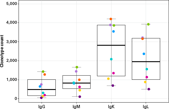 Figure 5. Clonotype counts from PBMC RNA obtained from different donors. IgG, IgM, IgK, and IgL clonotypes from 10 ng each of PBMC RNA from eight donors (represented by different colors) were determined using the SMARTer Human BCR IgG IgM H/K/L Profiling Kit. Libraries were normalized to 100,000 reads for analysis.