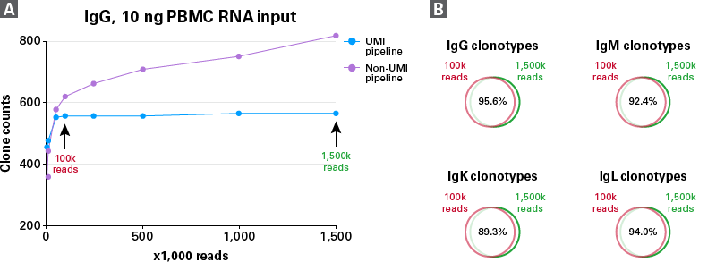 Figure 6. Evaluation of sequencing saturation for 10-ng PBMC RNA libraries. BCR profiling libraries from 10 ng of PBMC RNA from a single donor were prepared using the SMARTer Human BCR IgG IgM H/K/L Kit. Panel A. IgG clonotype counts at different sequencing depths are shown with (blue line) and without (purple line) UMI-based error correction. IgG and other chains (IgM, IgK, and IgL not shown) were sequenced at 1.5 million reads per library, then were downsampled to 1 million, 500K, 200K, 100K, 50K, 10K, and 5K reads. All analyses at different sequencing depths were generated with our Takara Bio Immune Profiler Software. Panel B. Venn diagrams showing overlapped clonotypes between libraries with low (100K) and high (1,500K) sequencing depths.
