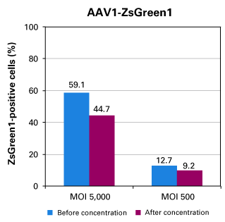 A biological assay commonly used to test the infectivity of an AAV preparation involves infecting permissive cells with AAV and measuring transgene expression to determine a titer in transducing units (TUs). To confirm the infectivity of AAV prepared using AAVpro Concentrator, flow cytometric analysis was used to compare ZsGreen expression in HT1080 cells infected with AAV1-ZsGreen1 vectors before or after concentration. HT1080 cells were infected with AAV at 5,000 or 500 vg/cell (MOI) and analyzed by FACS after three days. Concentrated AAV particles administered at MOIs of 5,000 or 500 were able to infect cells at rates of 44.7% or 9.2%, respectively.