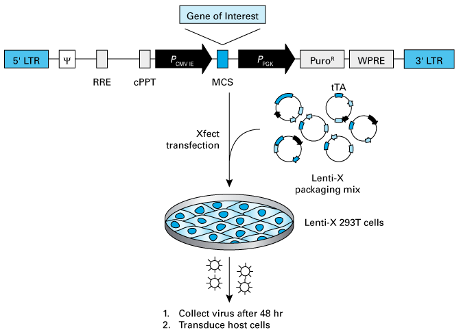 Recombinant lentiviruses are produced by cloning a sequence of interest into a lentiviral backbone containing all the necessary cis-acting elements required for virus function (Figure 1, Panel B). The resulting transfer vector is then mixed with a plasmid-based packaging mix that provides all the viral proteins required for virus particle production within a packaging cell. The transfer and packaging vectors are then combined with a transfection reagent (lipid or polymer), and the mixture is used to transfect a producer cell line, typically 293T-based cells, that can efficiently express the transfected constructs.