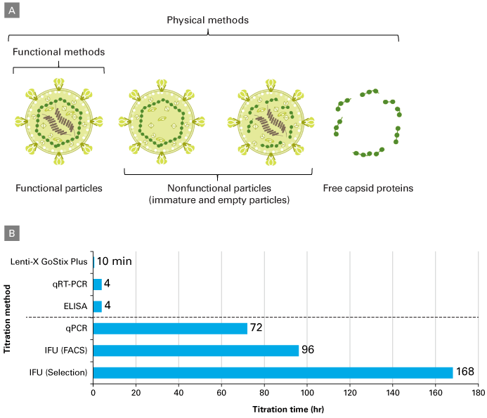 Figure 2. Types of titration methods. Panel A. Products present in lentiviral packaging supernatants. Physical methods can involve the measurement of both functional and nonfunctional particles, as well as free capsid proteins (e.g., p24) released in the supernatant. Functional titration methods specifically involve the measurement of functional viral particles. Panel B. Standard titration method timelines. Lenti‑X GoStix Plus: a lateral flow-based method for the detection of lentiviral p24 in supernatants. qRT-PCR: quantification of viral RNA genomes by qRT-PCR. ELISA: measurement of the amount of p24 capsid protein. qPCR: detection of integrated DNA proviruses by qPCR. IFU (FACS): determination of the percentage of infected cells via FACS analysis of RFP/GFP positive cells. IFU (Selection): infectious units determined by quantifying the number of drug-resistant colonies in transduced populations.