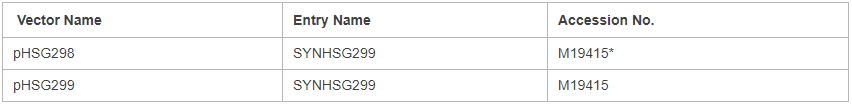 * Except for the MCS, pHSG298 has the same general sequence as pHSG299 with the following exception: pHSG298 lacks a G at position 1,446 in the sequence of pHSG299 that is registered with GenBank.