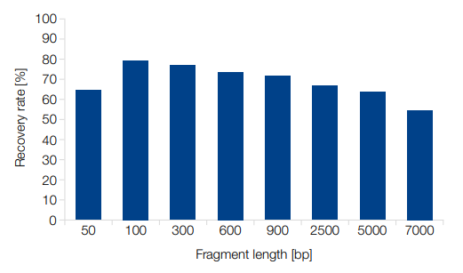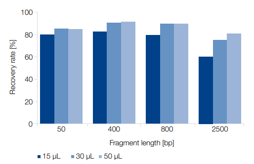 High recovery rates were achieved for fragments down to 50 bp, demonstrating the ability to reliably purify even short fragments into as little as 15 µL of elution volume (15 µL elution volume in dark blue, 30 µL elution volume in blue, and 50 µL in light blue).