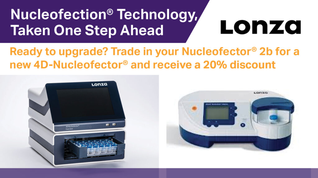 Lonza Nucleofector 2b special trade in offer. Trade in your Nucleofector® 2b for a new 4D-Nucleofector® and receive a 20% discount.