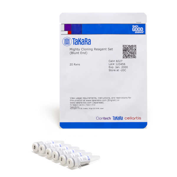 Takara’s Reagent Set for Mighty Cloning Kit (Blunt End) is designed to simply and quickly prepare PCR products for cloning into blunt-ended vectors. Because the blunting and 5′-phosphorylation reactions are done simultaneously, both blunt- and dA-ended products can be prepared in a single reaction. This kit eliminates the need for pre-treatment (such as enzyme inactivation, removal of unused dNTPs and primers, etc.), of PCR products. This kit includes the same ligation reagents as are included in Takara’s DNA Ligation Kit (Mighty Mix), which provide simple, quick, and efficient ligation. The kit is suitable for blunt-end cloning of PCR products obtained with PrimeSTAR HS and e2TAK DNA Polymerases.