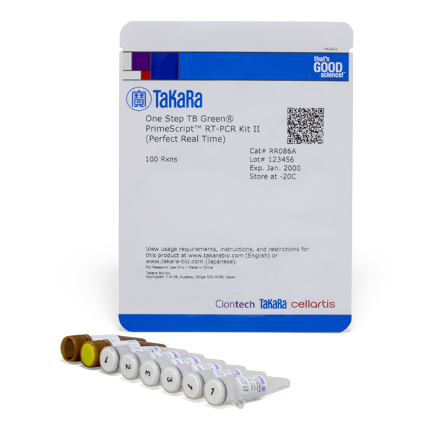 One-Step TB Green PrimeScript RT-PCR Kit II (Perfect Real Time) is designed for intercalator-based, one-step real-time RT-PCR using TB Green. All steps of RT-PCR can be performed in a single tube, allowing a simple procedure and minimizing the risk of contamination. Also, amplified products are monitored in real time, so there is no need to verify by electrophoresis after PCR. This kit is suitable for detection of tiny amounts of RNA such as RNA viruses. This kit uses PrimeScript RTase, which has excellent extendibility and can efficiently synthesize cDNA quickly, and Takara Ex Taq HS, a high-efficiency hot start PCR enzyme, optimized for one-step RT-PCR. This kit achieves a simple and convenient procedure with premixed components.